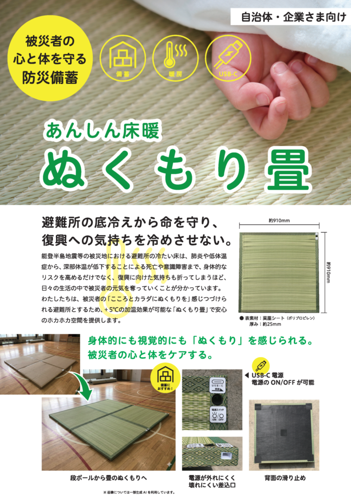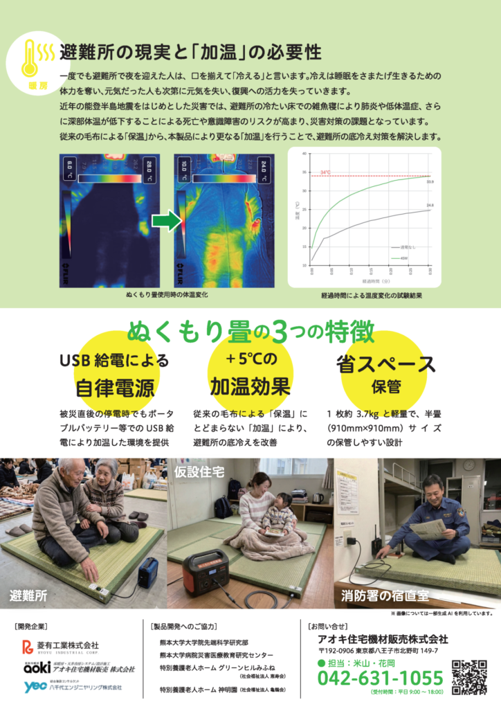 こうした中、床暖房・天井除湿放射冷暖房のアオキ住宅機材販売株式会社(代表取締役:米山 鐘一)では、+5℃の加温効果が可能な「ぬくもり畳」を八千代エンジニヤリング株式会社と菱有工業株式会社の三社で共同開発を進めており、被災者の「こころとカラダにぬくもりを」感じつづけられる製品として、避難所での安心のホカホカ空間を提供したいと考えております。